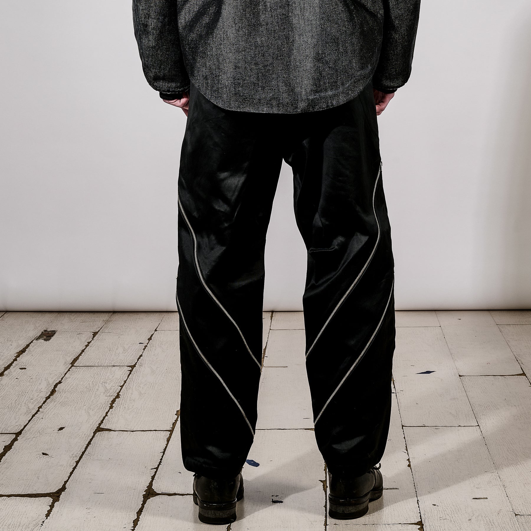 GUSSETED LEG OPENING WITH ZIP CLOSURES FOR ADJUSTABLE LEG OPENING WIDTH.